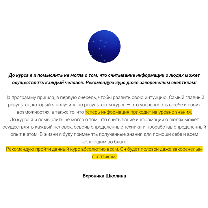 В результате прохождения модуля вы сможете вновь встретиться с Душами своих ушедших близких и получить от них подлинные доказательства того, что смерти нет и с ними все хорошо! Также вы научитесь считывать духовные послания для других людей, потерявших близких, и помогать им справляться с болью утраты!